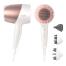 Мощность - 1800 Вт, вес - 0.92 кг, шнур - 2 м, ионизация, режим подачи холодного воздуха, насадка концентратор (7 мм), диффузор, массажная насадка, цвет - белый с розовым